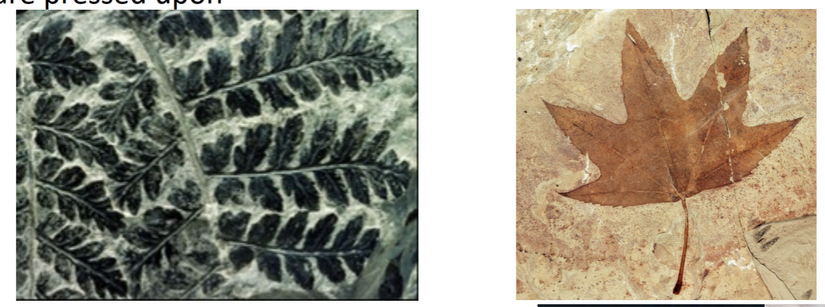 – Eventually, all materials that make up the body of a dead organism break down from heat and immense weight of overlying layers of sediment, leaving nothing but a thin film or residue of carbon (forms shape of body outline)