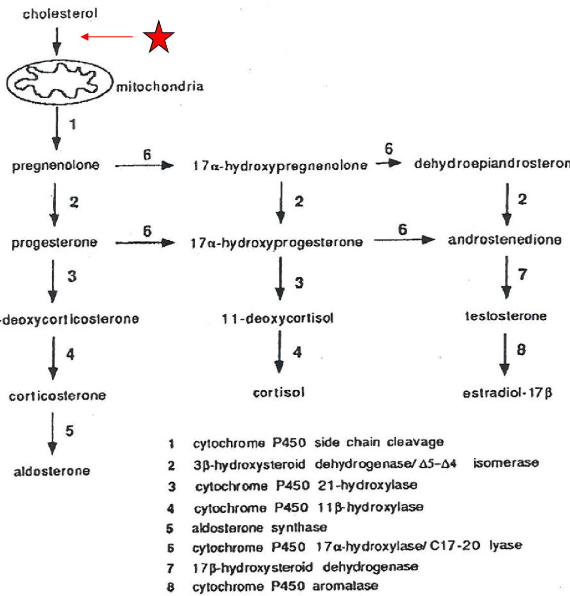 -P450scc (scc=side chain cleavage) (converts cholesterol to precursor steroids)