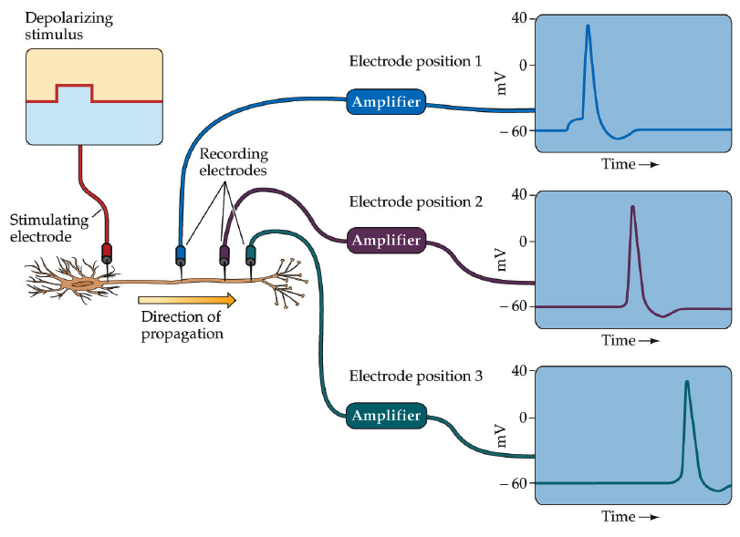 Electrodes may be placed along an axon and will collect data at different times depending on the direction of the action potential.