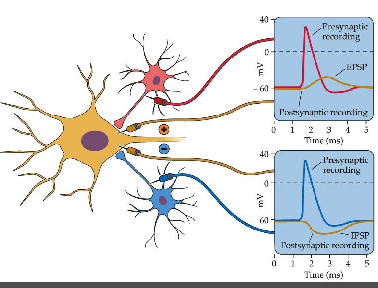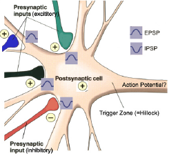 b) Neurons perform information processing to integrate synaptic inputs. Generally the combined effect of many excitatory synapses is required for a post-synaptic neuron to fire. IPSPs and EPSPs are summed together.