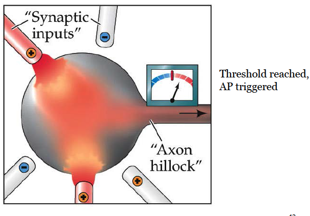 Spatial summation is the summing of potentials that come from different parts of the cell. If the overall sum – of EPSPs and IPSPs – can depolarize the cell at the axon hillock, an action potential will occur.