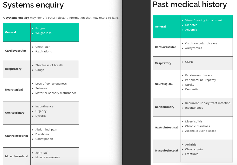 If a patient has a fall you need to do a falls risk assessment, what are some components involved in this?