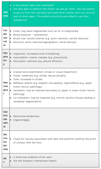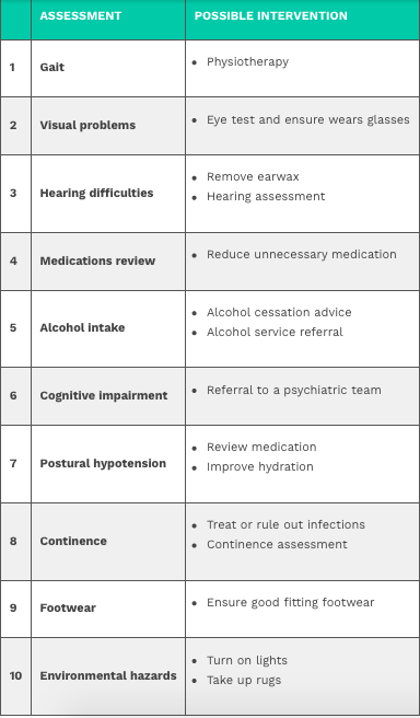 If a patient has a fall you need to do a falls risk assessment, what are some components involved in this?