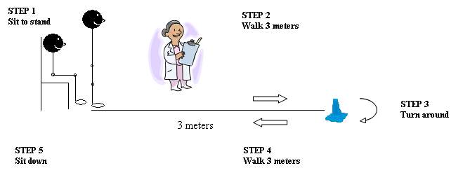 Time the person getting up from a chair without using their arms, walking 3 metres, turning around, returning to the chair, and sitting down. If the person usually uses a walking aid, this can be used during the test.