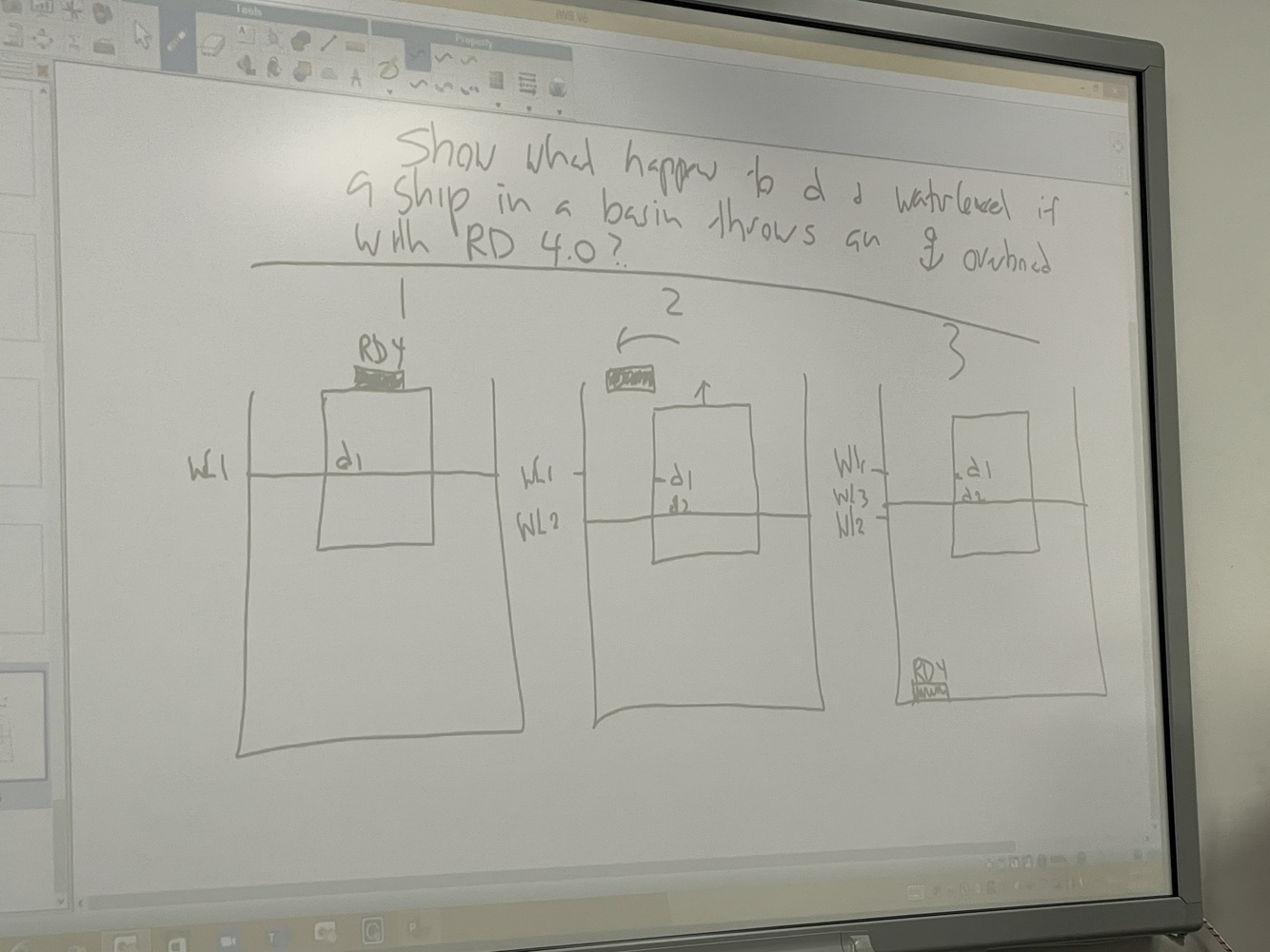 See example attched: what happens to the draft and water level when throwing an anchor out while in a basin?