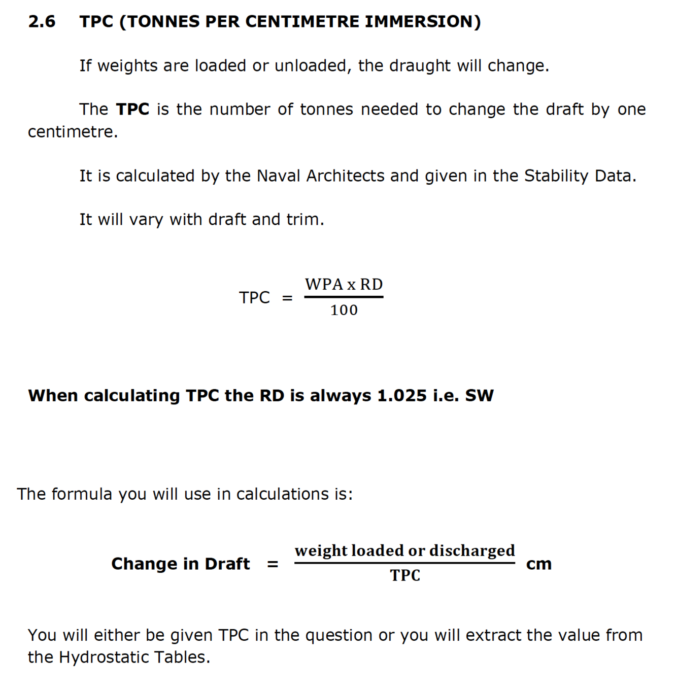 The TPC is the number of tonnes needed to change the draft by one centimetre.