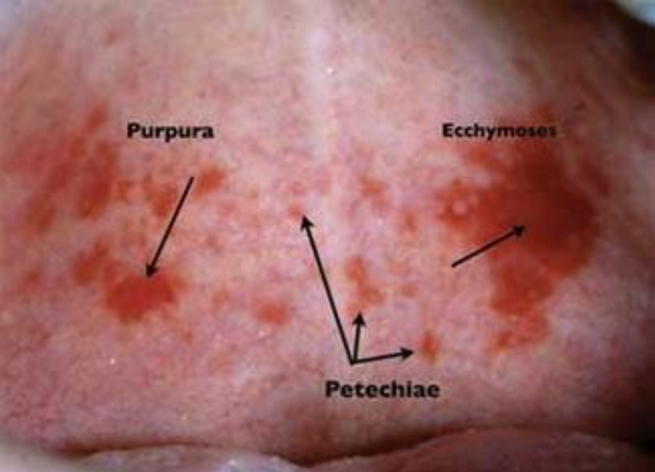 Minúsculas hemorragias de 1 a 2 mm, se ocasionan por un deficit de plaquetas