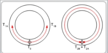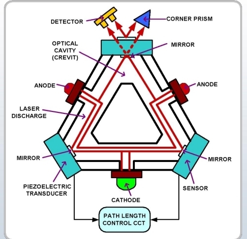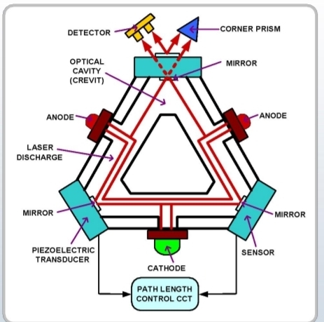 The better way to look at it is that the two waves are send in opposite directions around the ring. They combine to form a standing wave with nodes and anti-nodes. When the ring moves, the fluid moves, but the standing wave does not move with it. There is a sensor in the ring which moves and to the sensor, it appears that the standing wave is moving past. The sensor counts the standing waves.