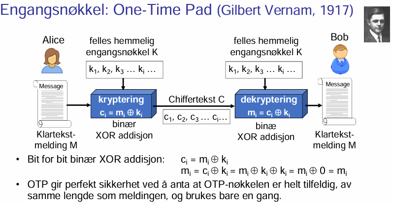 Hva slags egenskaper har engangsnøkkel / OTP (one time pad) ?