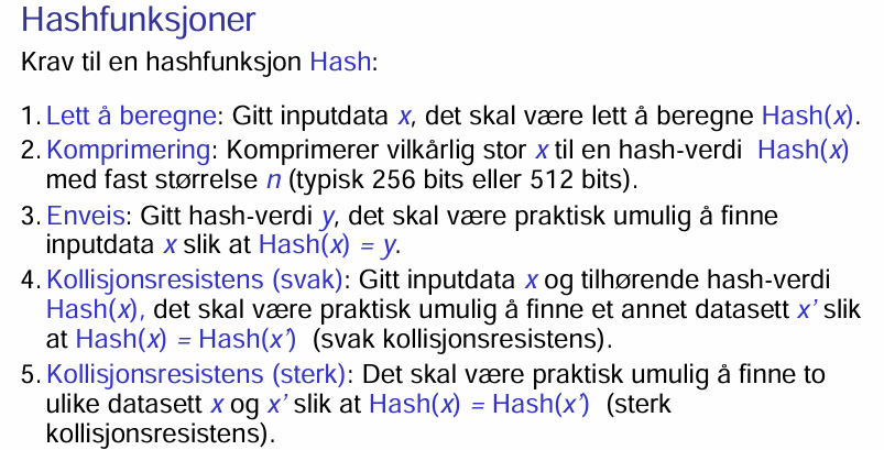 Hvilke 4 krav stilles til en Hashfunksjon?