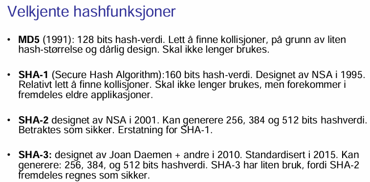 Hvilke 4 kjente hash-funksjoner har vi lært om (sikkert flere og) i in2120 og hva slags egenskaper (størrelse, bruk) og historie er det rundt dem?
