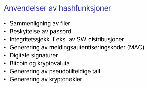 Nevn minst 4 vanlige bruksområder for hashfunksjoner