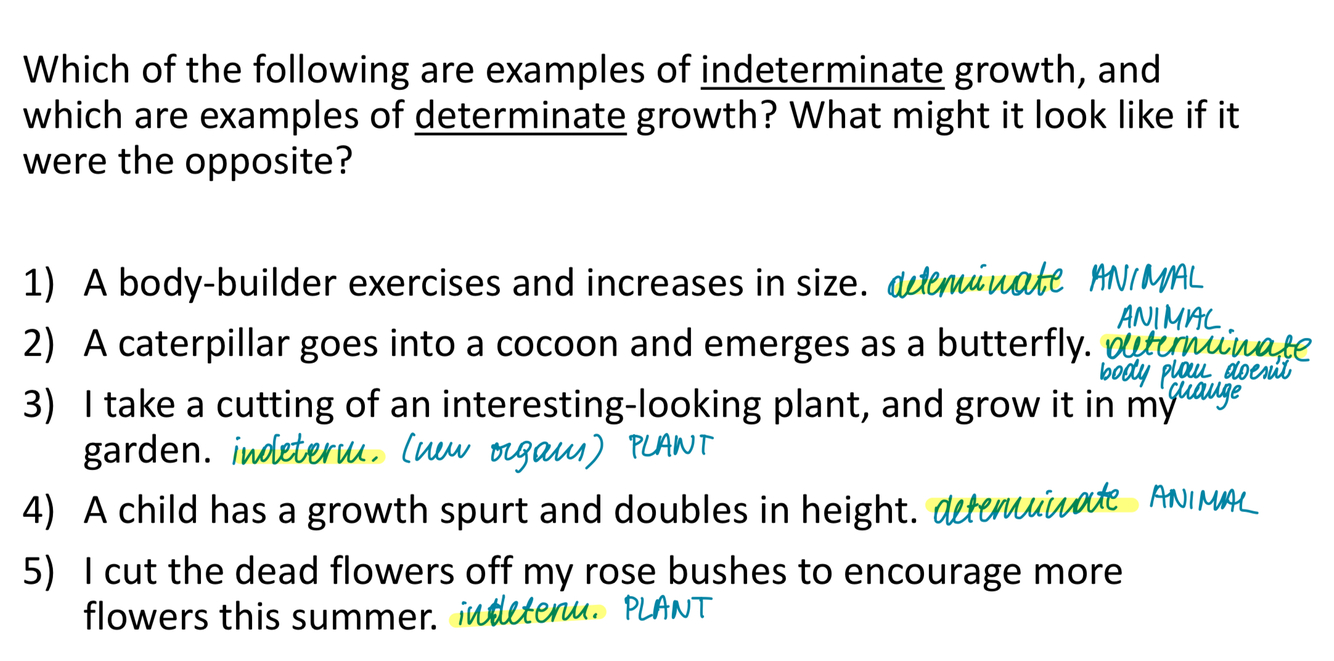 Give examples of indeterminate and determinate growth