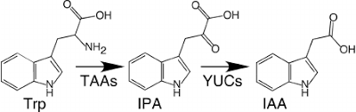 Auxin - indole-3-acetic acid (IAA) - simple amphiphilic molecule derivd from tryptophan