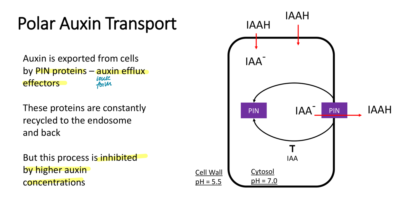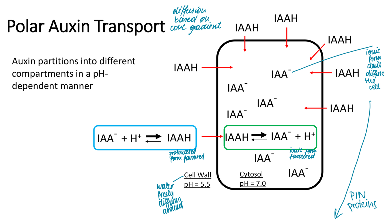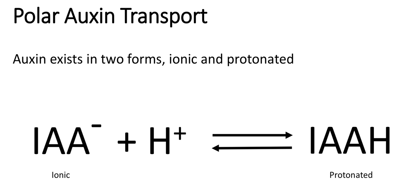 IAAH enters the cell, IAA- exported out but only through PIN - ionic form can’t diffuse