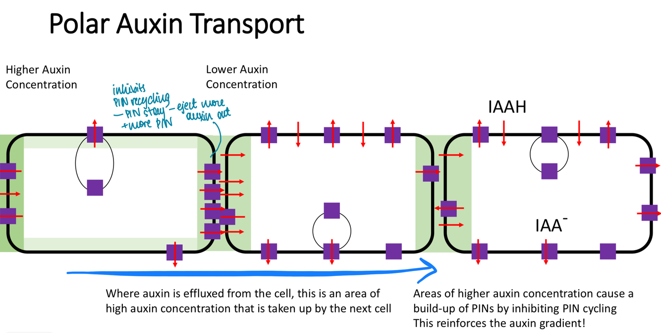 Auxin moves from high to lower conc between plant cells - at high auxin levels PIN proteins less recycled - stay in membranes to efflux auxin out => creates auxin-PIN regions of high conc