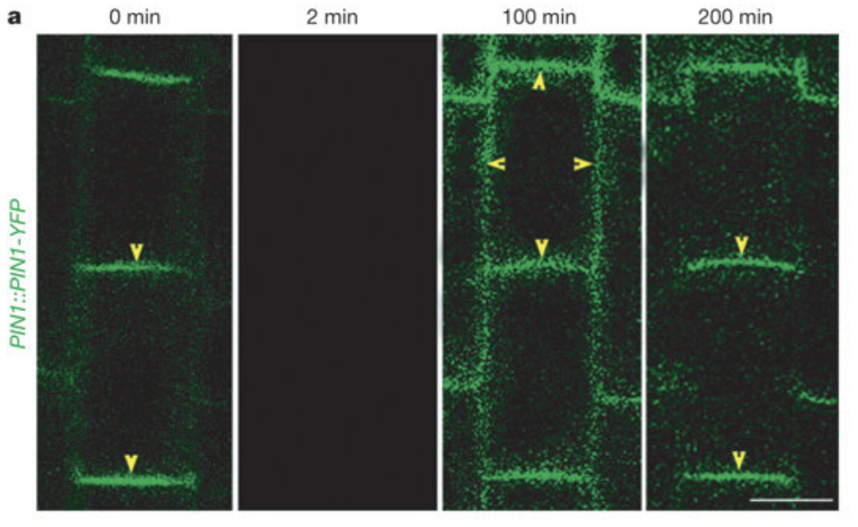PIN proteins are constantly recycled in endosome - when auxin conc rises - inhibits recycling - more PIN stain in cell wall - export auxin