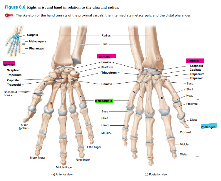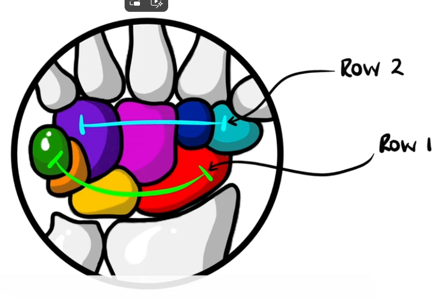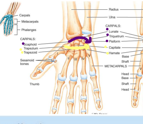 scaphoid, lunate, triquetrum, pisiform, trapezium, trapezoid, capitate, hamate