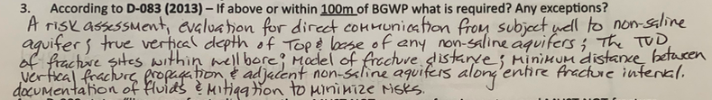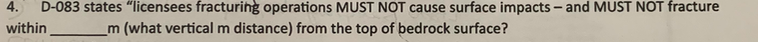 D-083 states “licensees fracturing operations MUST NOT cause surface impacts – and MUST NOT fracture within _______m (what vertical m distance) from the top of bedrock surface?
