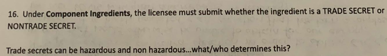 Under Component Ingredients, the licensee must submit whether the ingredient is a TRADE SECRET or NONTRADE SECRET
