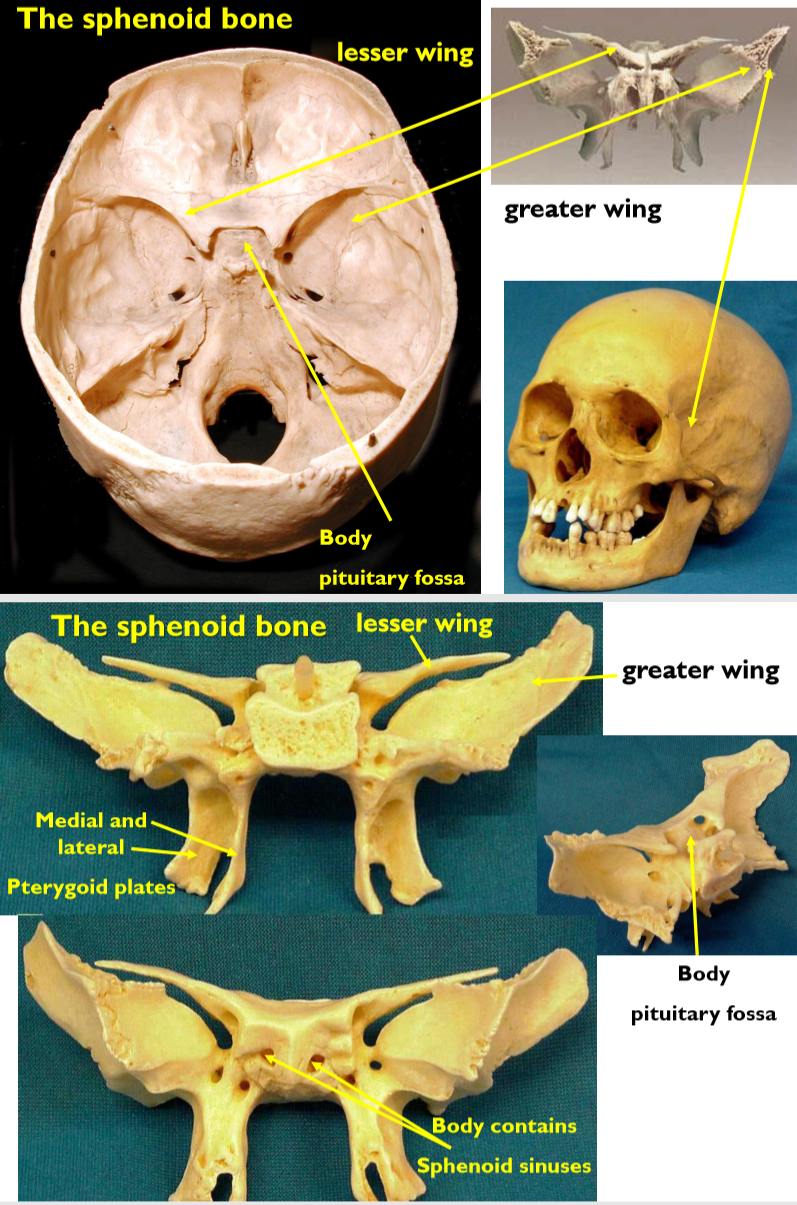 Describe the structure of the sphenoid bone and how it appears in the skull.