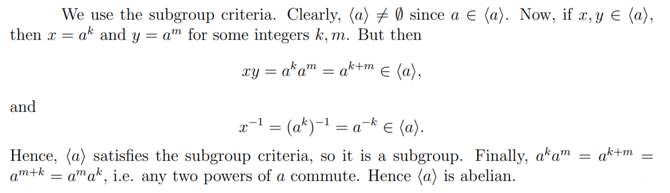 Describe the proof that a cyclic subgroup is an abelian subgroup