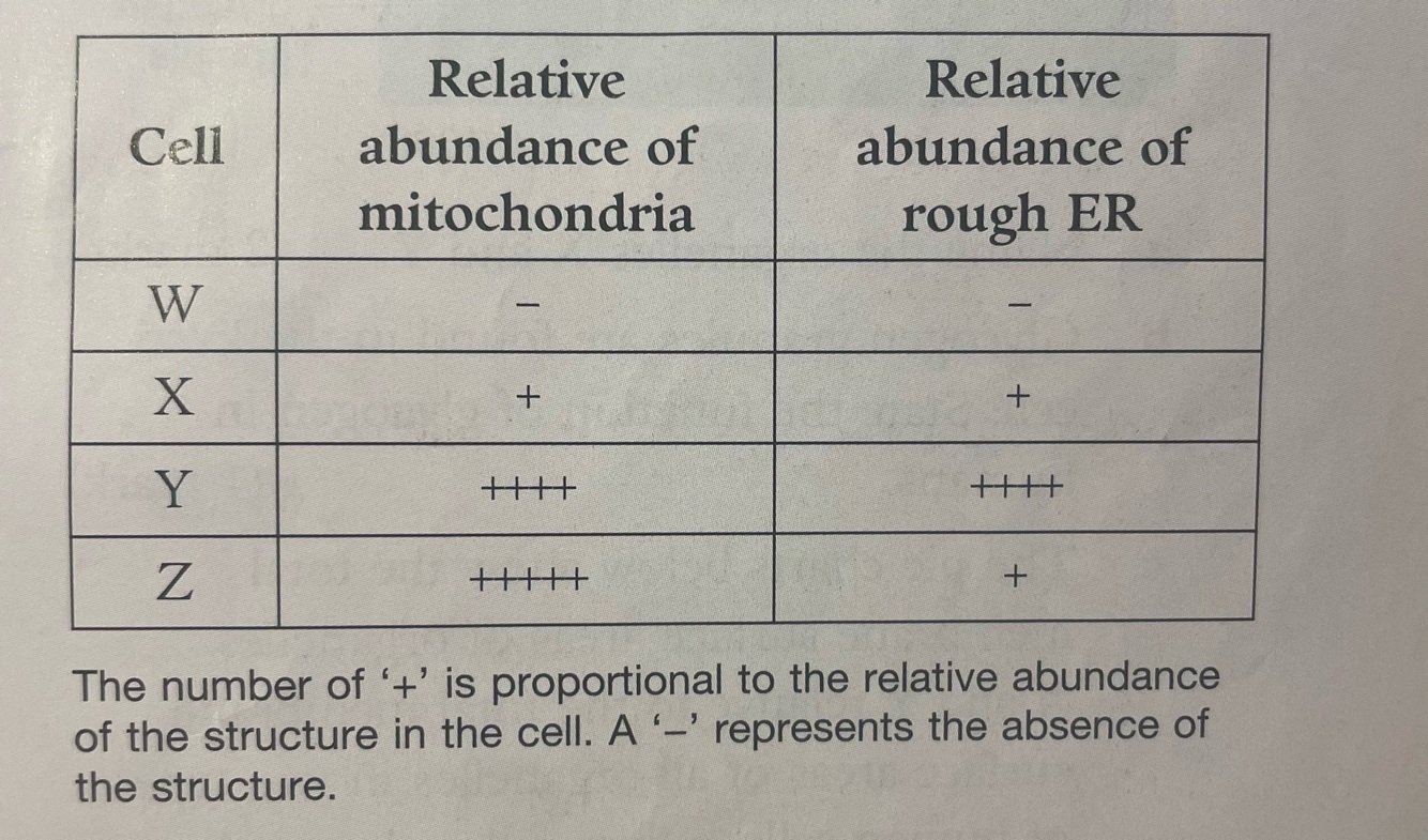 The table below shows the relative abundance of mitochondria and rough endoplasmic reticulum in four cells (W, X, Y, Z).