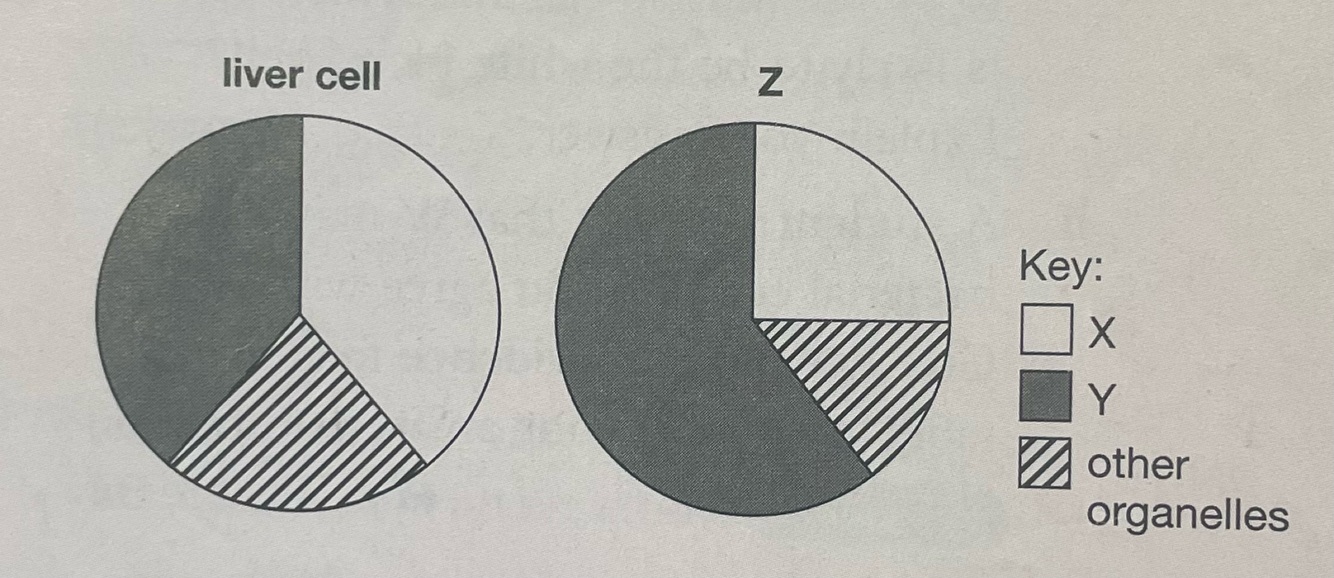State one piece of evidence from the pie charts that cell Z may produce more proteins than the liver cell and explain.