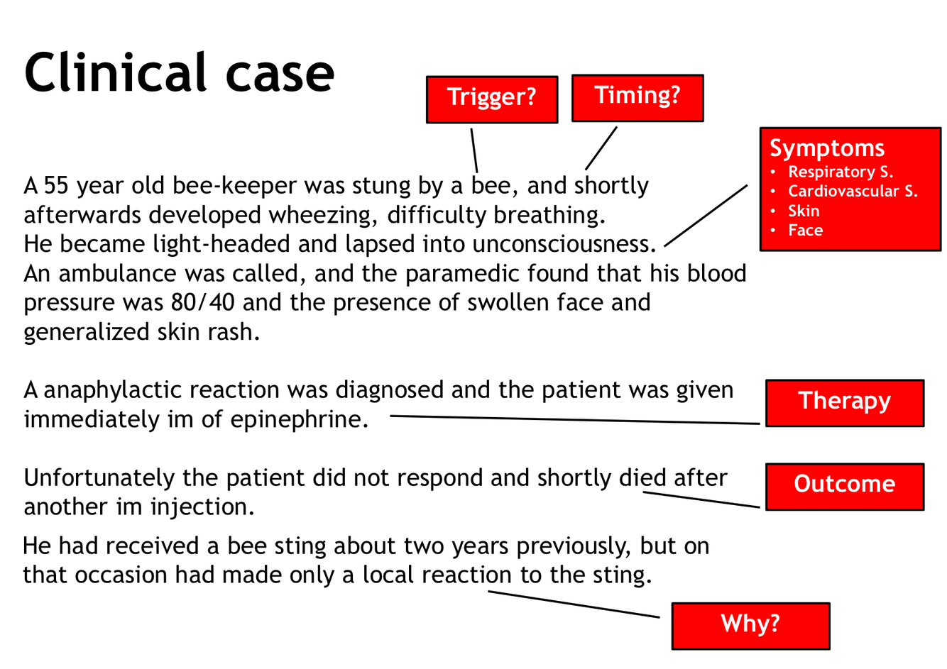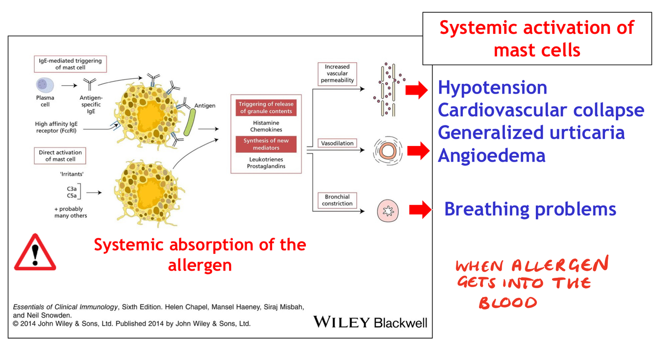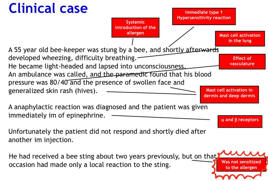 Why may someone be stung by a bee and have a local reaction and then five years later be stung by a bee and go into anaphylaxis?