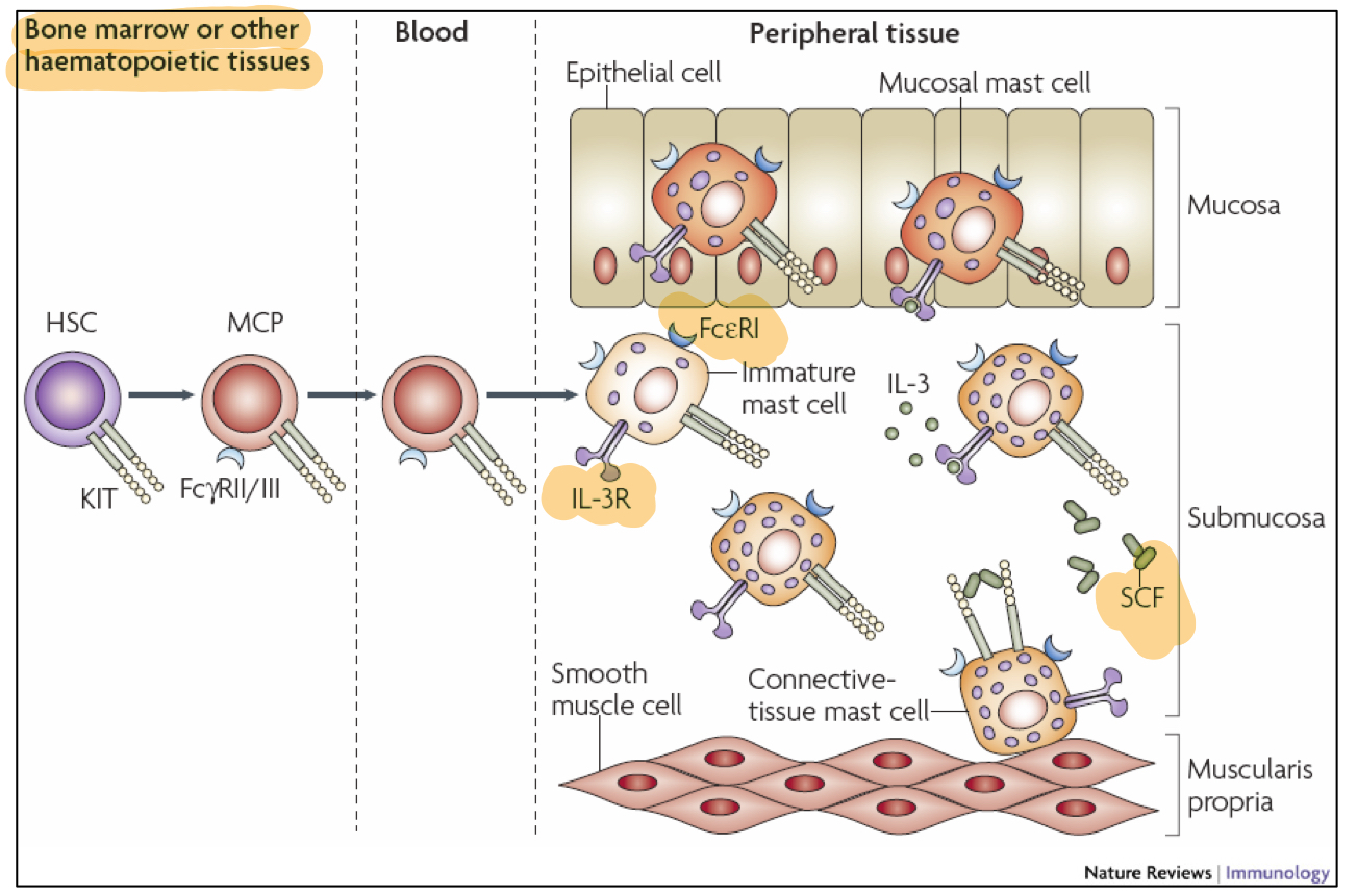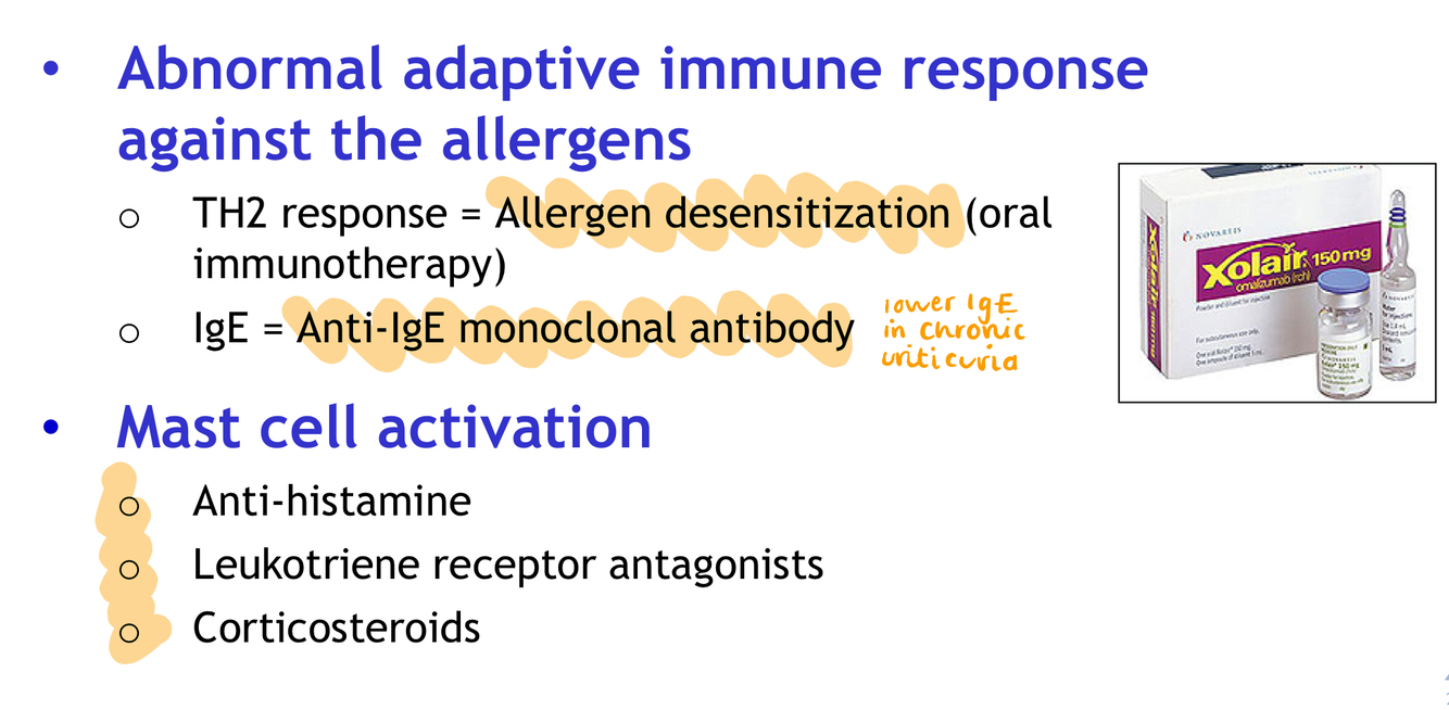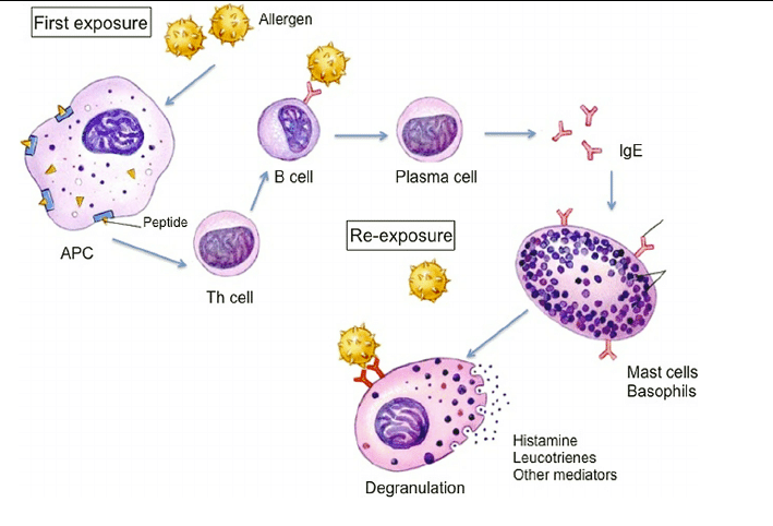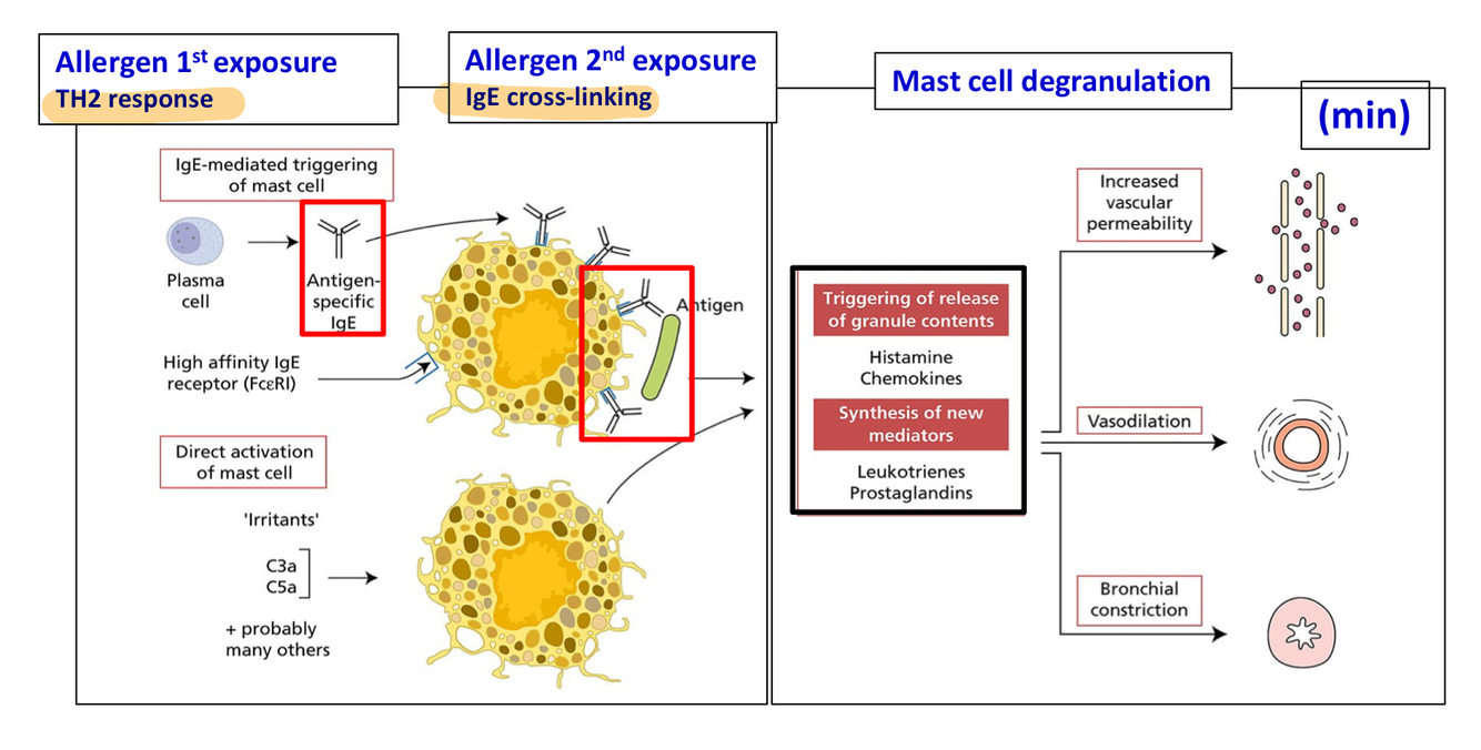 - Abnormal adaptive immune response against the allergens: TH2 response, IgE production