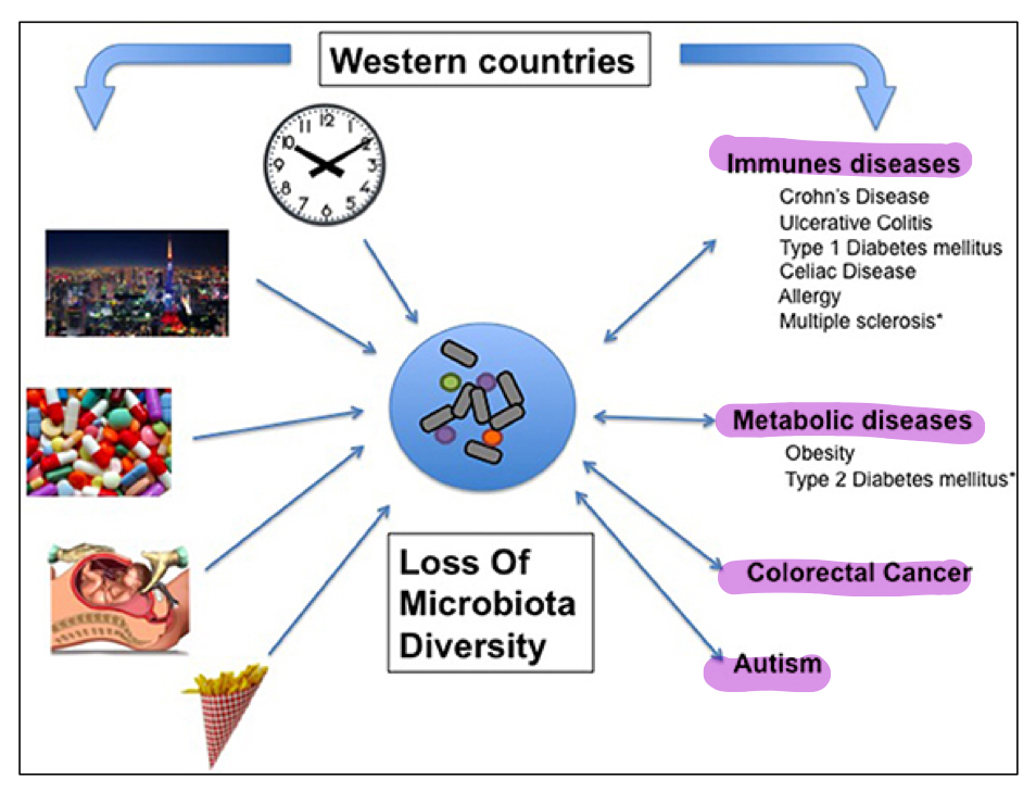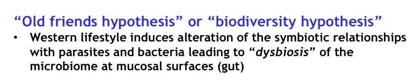 - Microbial dysbiosis: alteration of the symbiotic relationships with parasites and bacteria