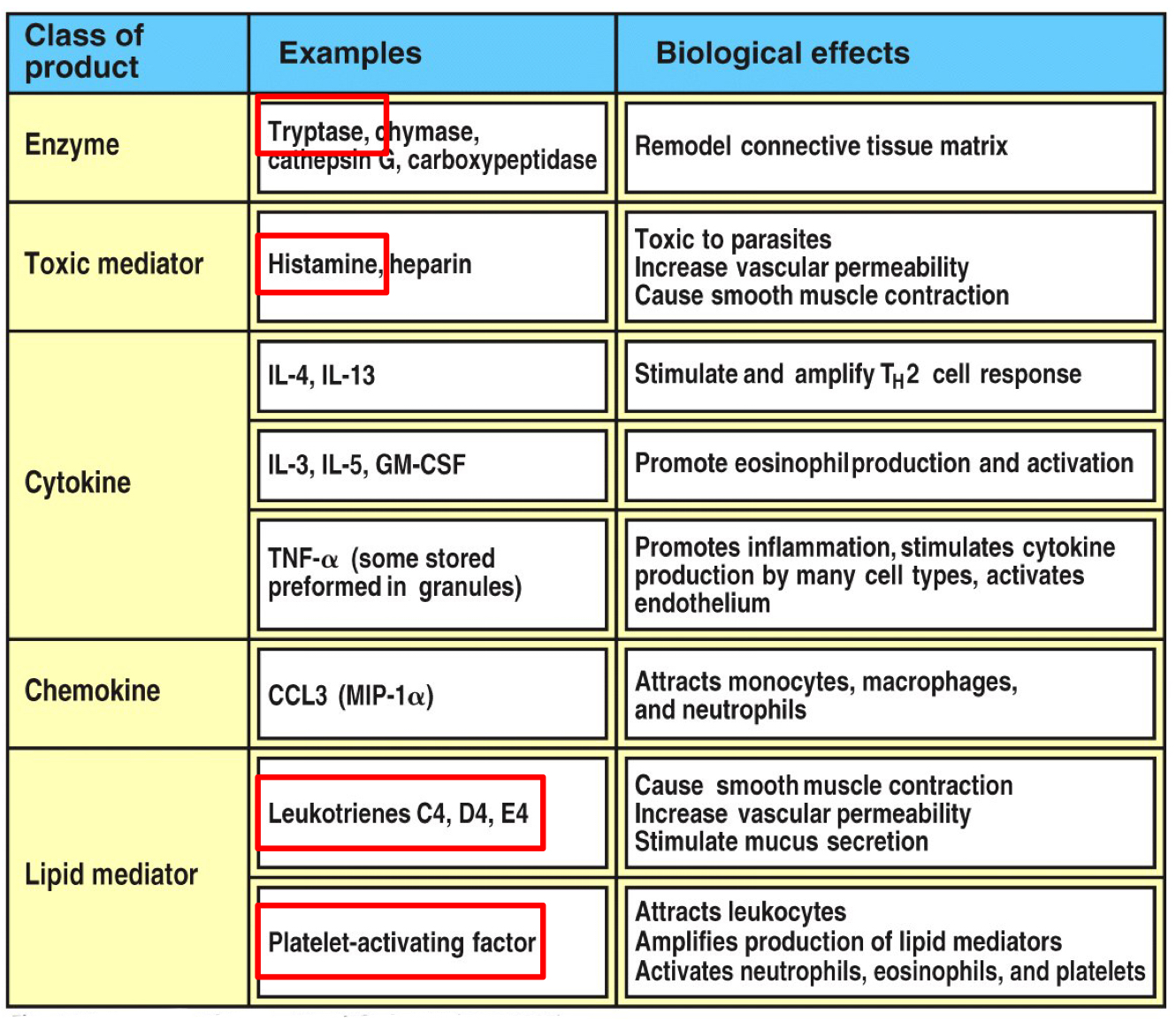 What are some important mast cell mediators that are involved in an allergic reaction and what are their biological effects?