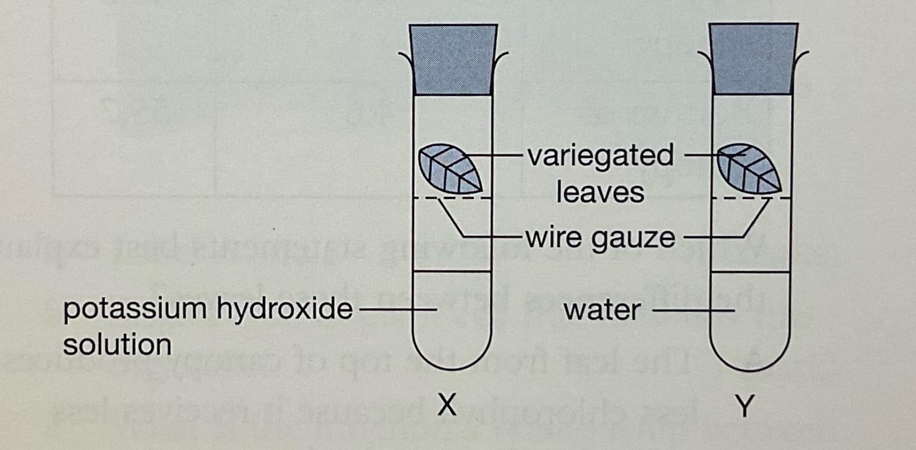 An experiment is carried out to determine the requirement of photosynthesis. Two variegated leaves are cut from a destarched plant and put into test tubes containing potassium hydroxide or water. The test tubes were put under sunlight for 4 hours.