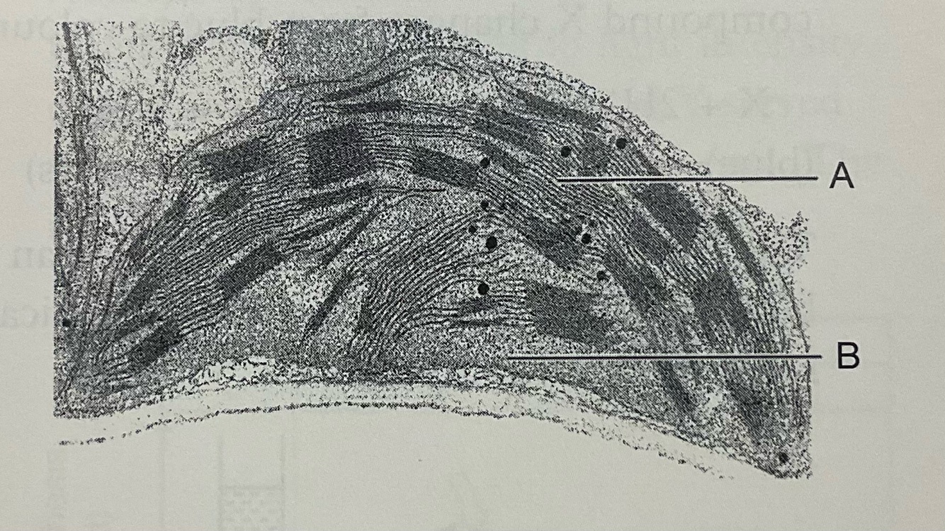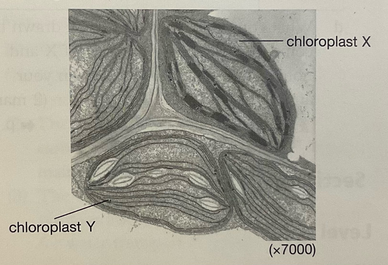 The electron micrograph below shows two chloroplasts X and Y in a leaf.