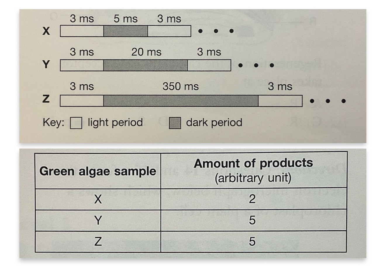 A scientist measured the amount of photosynthetic products produced by three samples of green algae using light flashes. The table below shows the experimental results.