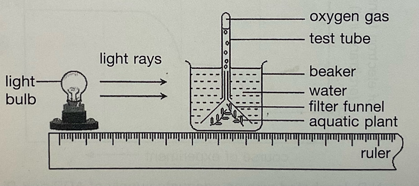The diagram below shows an experimental set-up for investigating the effect of light intensity on the rate of photosynthesis.