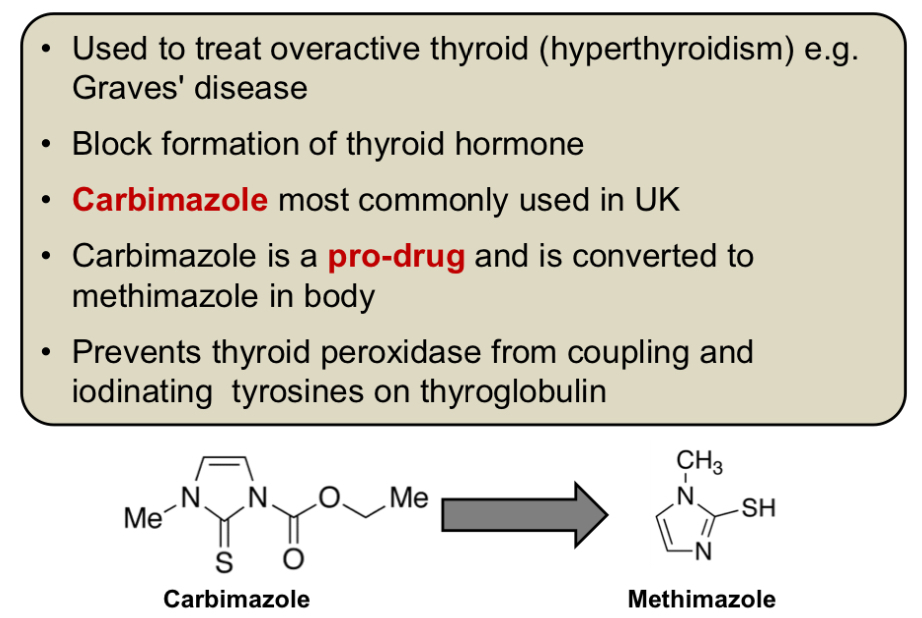 - Carbimazole (or propylthiouracil) : inhibits thyroid peroxidase so iodination and coupling of tyrosine residues on thyroglobulin doesn’t work