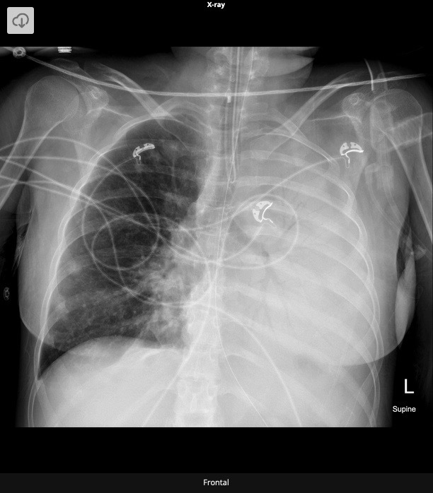 Complete white-out of the hemithorax with air bronchograms and trachea in a central position is consistent with consolidation secondary to pneumonia. The patient is on linezolid, micafungin, and piperacillin-tazobactam pending culture and susceptibility studies.