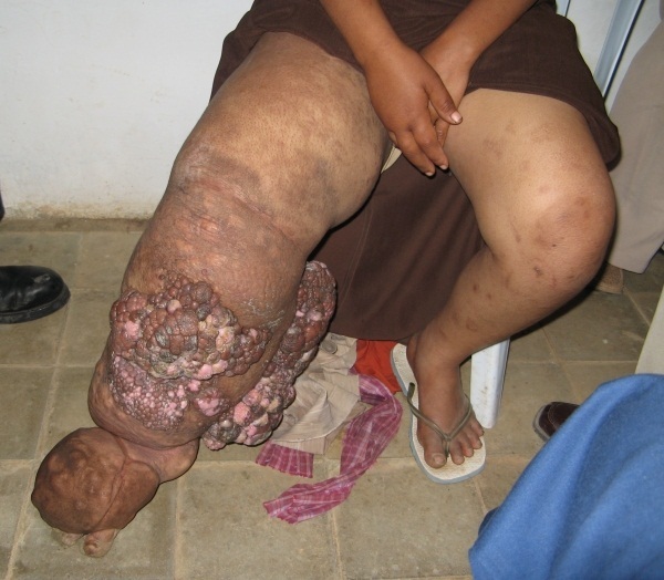 Klippel-Trenaunay Weber syndrome is characterized by a triad of port-wine stain, varicose veins, and bony and soft tissue hypertrophy involving an extremity. Filariasis is an acquired infection that leads to obstruction and scarring of the lymphatics. Neurofibromatosis is associated with neurofibromas, café-au-lait macules and Lisch nodules, but not with lymphedema and vascular malformations. Proteus syndrome is associated with vascular abnormalities, lipomas and asymmetric limb hyperplasia, and plantar connective tissue nevi, but usually not lymphedema. Lymphedema of the dorsal hands and feet can be seen in Turner syndrome, but typically not this extensive.