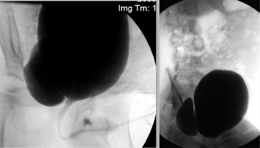The imaging reveals a large congenital right sided bladder diverticulum. There is no evidence of bladder outlet obstruction or valves. This is a source of stasis (incomplete bladder emptying) that will not spontaneously resolve. Smaller periureteral diverticula are associated with dysfunctional elimination and are not treated surgically but in this case diverticulectomy is indicated. Based upon the size of the diverticulum, this child will almost certainly have recurrent infections. As such, prophylactic antibiotics or observation are not appropriate options in a pediatric patient. The diverticulum arises cephalad and lateral to the ureteral orifice. The ureter and diverticulum are intimately associated. The ipsilateral ureter should be reimplanted if it is near or included in the diverticulum whereas a diverticulum on the lateral bladder wall or dome (urachal diverticulum) can be resected without ureteral reimplantation. Both can be performed extravesically with entry into the bladder only when the diverticulum is entered.