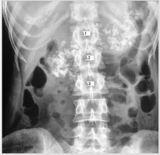 Note: pancreatic calcifications are noted in the x-ray and are indicative of chronic pancreatitis