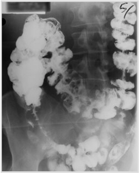 a 19 year old boy presents with finger clubbing, weight loss, watery diarrhea and a mass in the right iliac fossa. A barium enema of the gastrointestinal tract was performed, and findings were as below. What is the likely diagnosis?