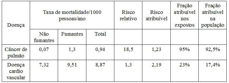 A tabela a seguir apresenta dados de um estudo de coorte referentes às taxas de mortalidade para câncer de pulmão e para doença cardiovascular entre fumantes (Doll & Hill, Br. Med.J., 1956; 2:1071-81). (VER IMAGEM) De acordo com os dados apresentados, todas as alternativas estão corretas, EXCETO:
