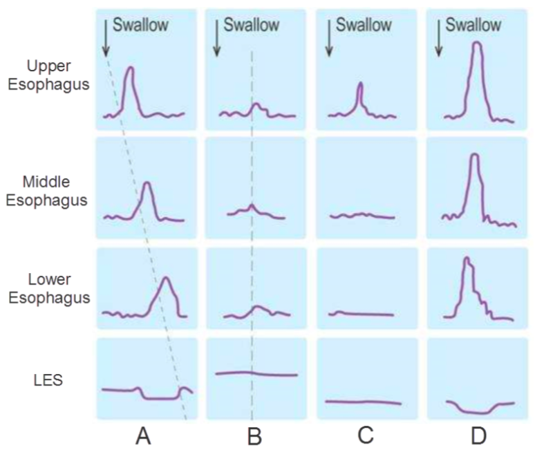 A patient presented with retrosternal chest pain and dysphagia of both solid andliquid. Barium swallow x-ray showed,Choose the appropriate esophageal manometry