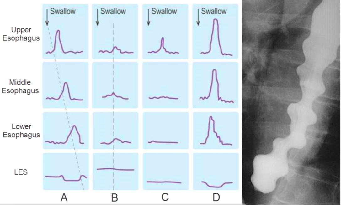 A patient presented with retrosternal chest pain and dysphagia of both solid andliquid. Barium swallow x-ray showed,Choose the appropriate esophageal manometry