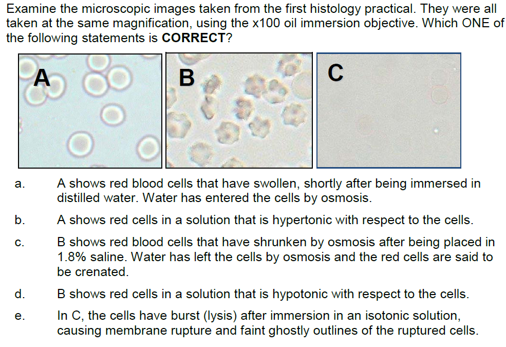 c. B shows red blood cells that have shrunken by osmosis after being placed in 1.8% saline. Water has left the cells by osmosis and the red cells are said to be crenated