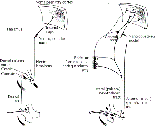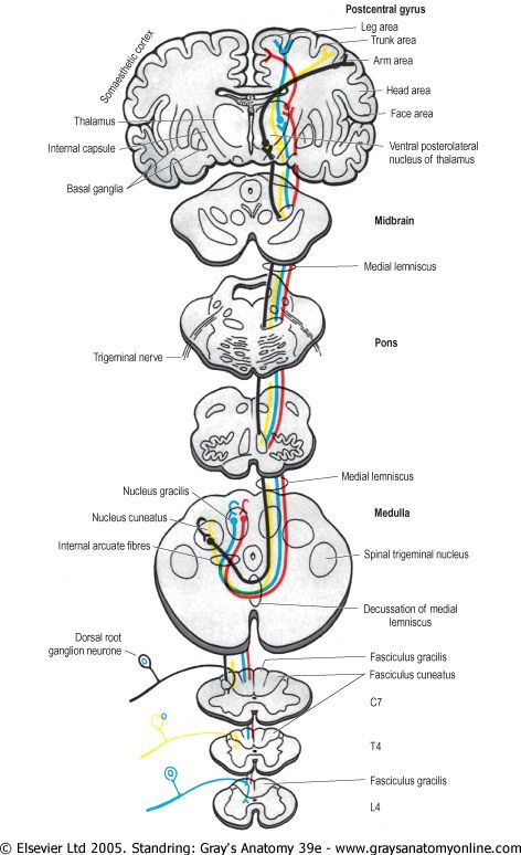 Axons from mechanoreceptors and proprioceptors ascend the spinal cord in the dorsal columns. These carry fibres from the ipsilateral side of the body and continue to the dorsal column nuclei at the level of the medulla