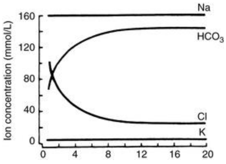 This is a graph of ion concentrations in pancreatic secretion at different rates of secretion. Which of the following is correct?