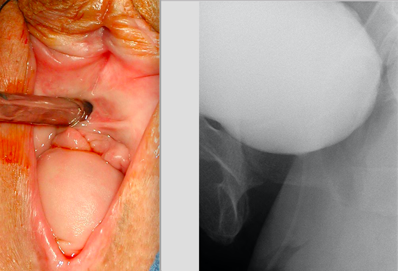 This patient has vaginal vault prolapse. The image from the videourodynamics study does not demonstrate a cystocele. The majority of physicians would recommend that this patient should undergo repair of the vault prolapse with a concurrent anti-incontinence procedure. The concurrent anti-incontinence procedure is performed due to the increased risk of de novo stress incontinence following vault suspension. In the context of a robotic sacrocolpopexy, a midurethral sling would be the most appropriate approach. Urodynamics, with or without prolapse reduction, are not predictive of which patients will develop de novo SUI following vault suspension. While acceptable to proceed with robotic sacrocolpopexy and no sling, the patient should be informed of the risk of postoperative stress incontinence. Some patients may prefer this approach due to the inherent risks of sling procedure, however rare they may be.