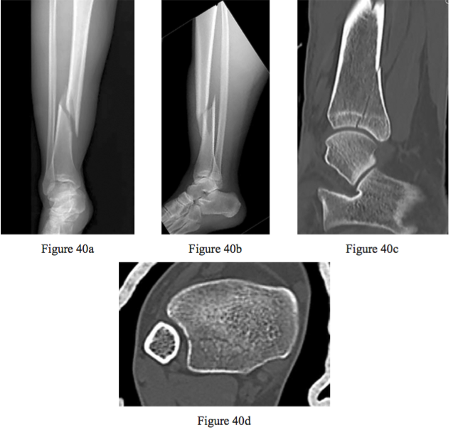 Figures 40a through 40d are the radiographs and CT scans of an 18-year-old woman who sustained a tibia/ bula fracture. Prior to intramedullary nailing of the tibia, the physician should